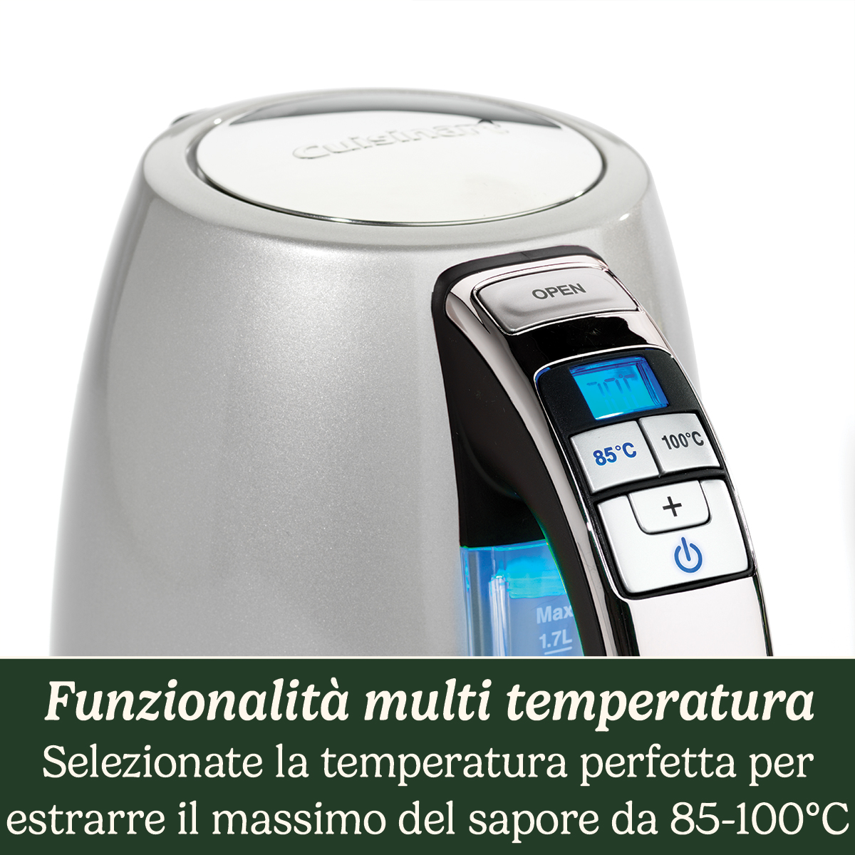 È possibile impostare la temperatura dell'acqua tra 85 ° C e 100 ° C, con incrementi di 5 ° C. La temperatura viene visualizzata sullo schermo LCD. Con 2750 watt di potenza, il bollitore fa bollire rapidamente l'acqua e l'impugnatura ergonomica offre un eccellente equilibrio per versare senza schizzi.