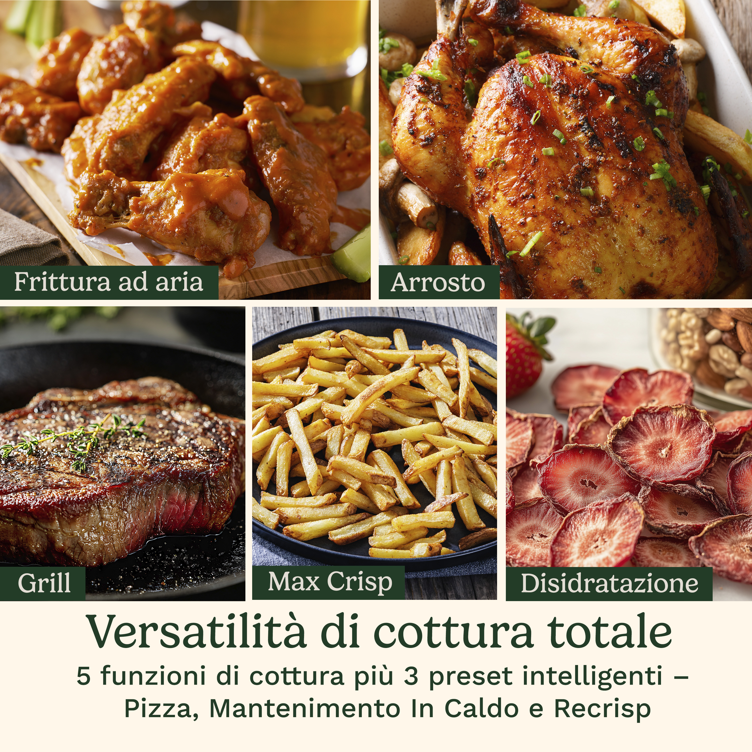 - 8 FUNZIONI DI COTTURA VERSATILI E PRESET: Personalizza ogni piatto esattamente come lo preferisci con Air Fry, Arrosto, Grill, Max Crisp e Disidratazione, oltre a tre preset intelligenti – Pizza, Mantenimento in caldo e Recrisp. Un solo elettrodomestico, infinite possibilità."