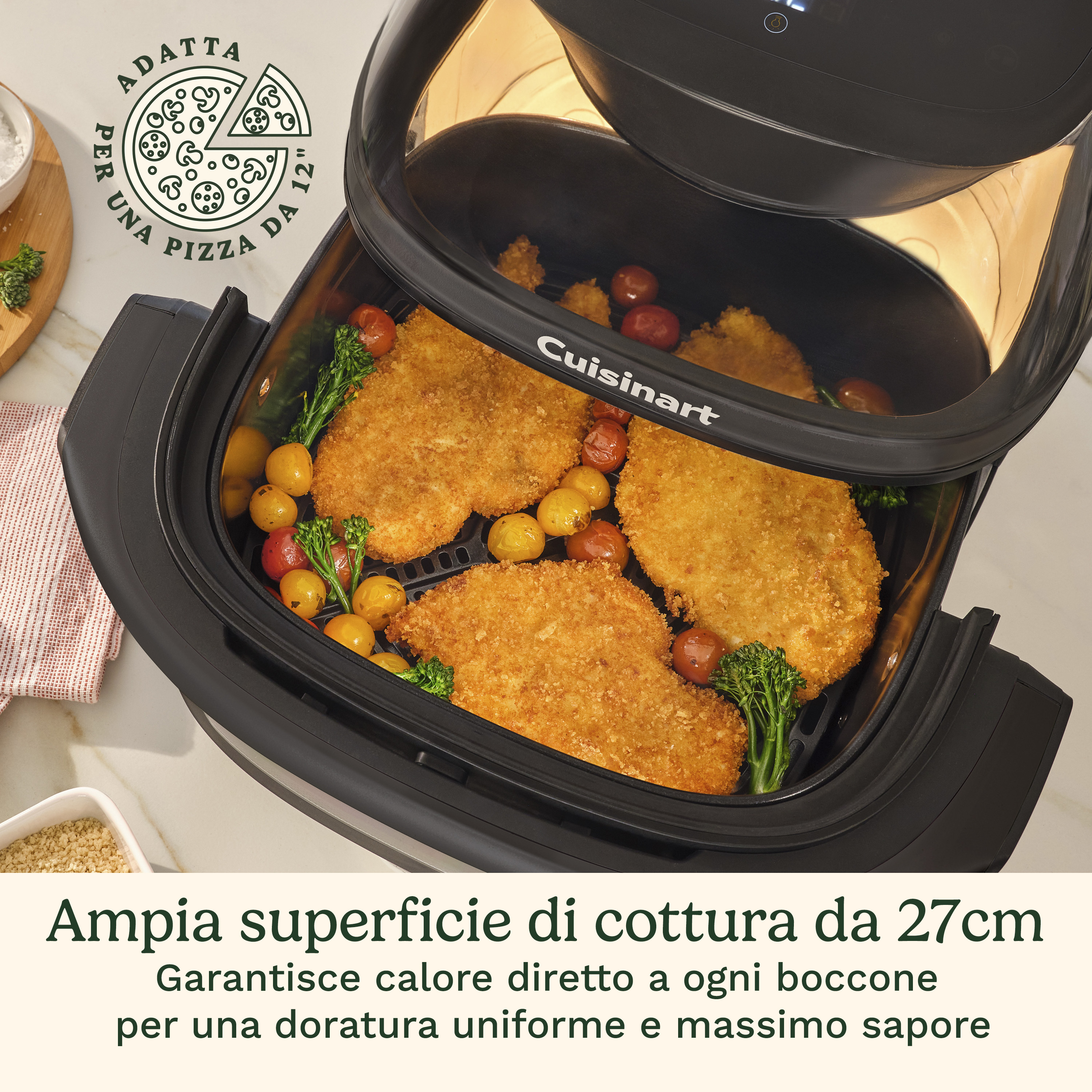 - SUPERFICIE DI COTTURA EXTRA‑LARGA DA 27CM: La base extra‑larga consente agli alimenti di cuocere in un unico strato per una doratura uniforme, calore diretto e massimo sapore, senza bisogno di sovrapporli."