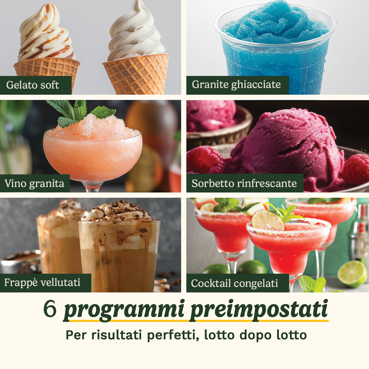 - 6 Specialità Ghiacciate con un’unica Macchina: Prepara gelato soft, granita, sorbetto, frappé e frosé – più varietà con un unico apparecchio potente.