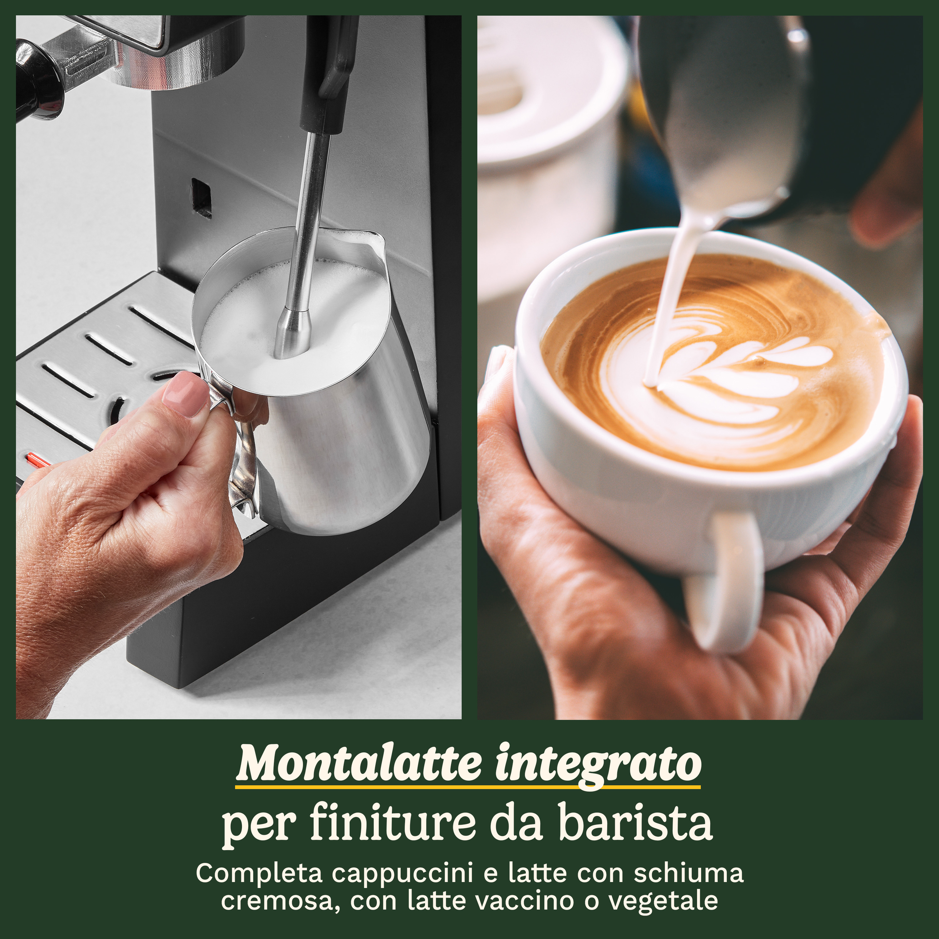 - Schiuma perfetta, come piace a te: La lancia a vapore integrata crea micro-schiuma setosa per i latte, schiuma cremosa per i cappuccini o semplicemente acqua calda per tè - ideale per latte vaccino o vegetale.