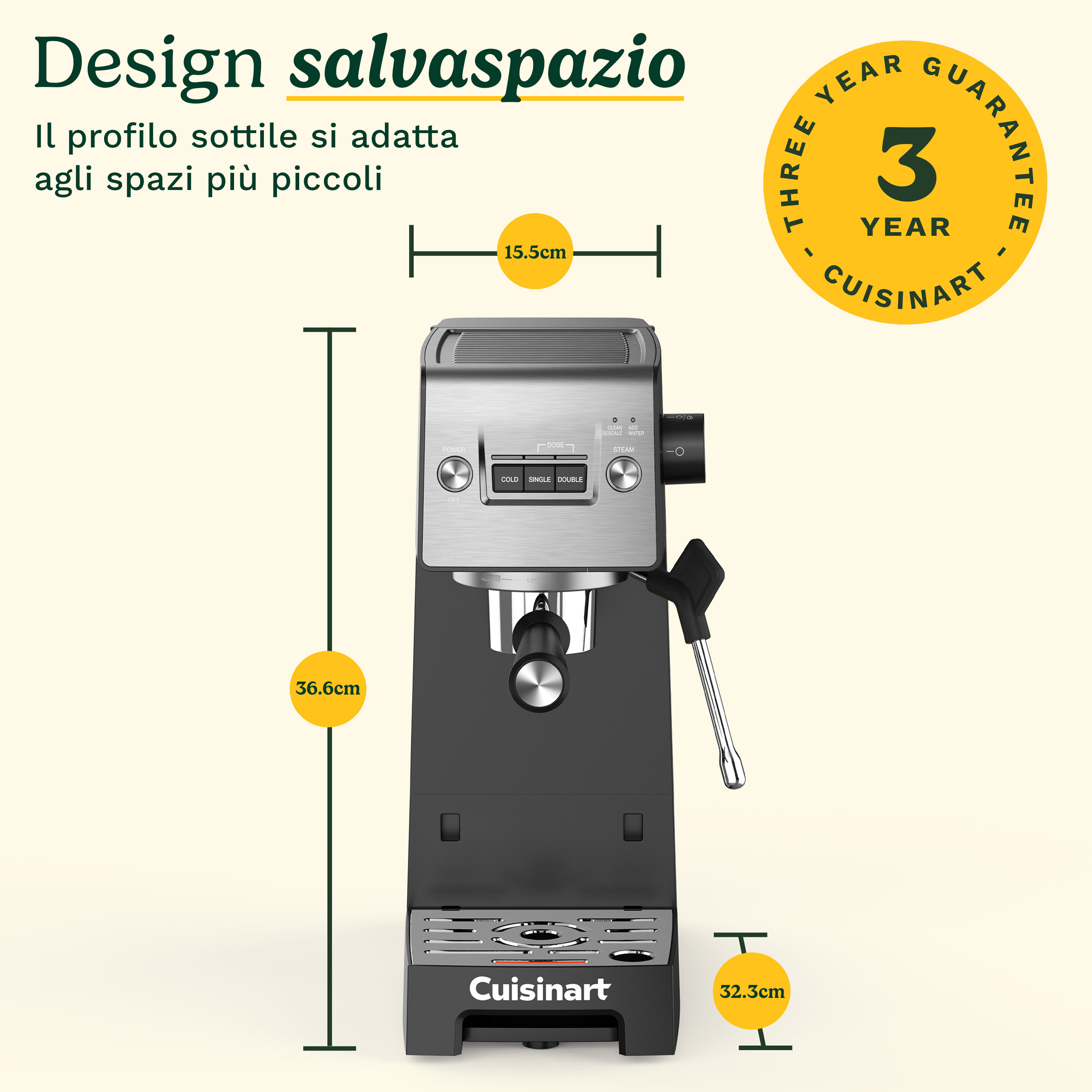 - Design compatto, grande comodità: Con un serbatoio d’acqua rimovibile da 1,5l, vassoio raccogligocce regolabile e piastra scaldatazze, è perfetta per cucine piccole, mattine frenetiche o piani di lavoro eleganti.