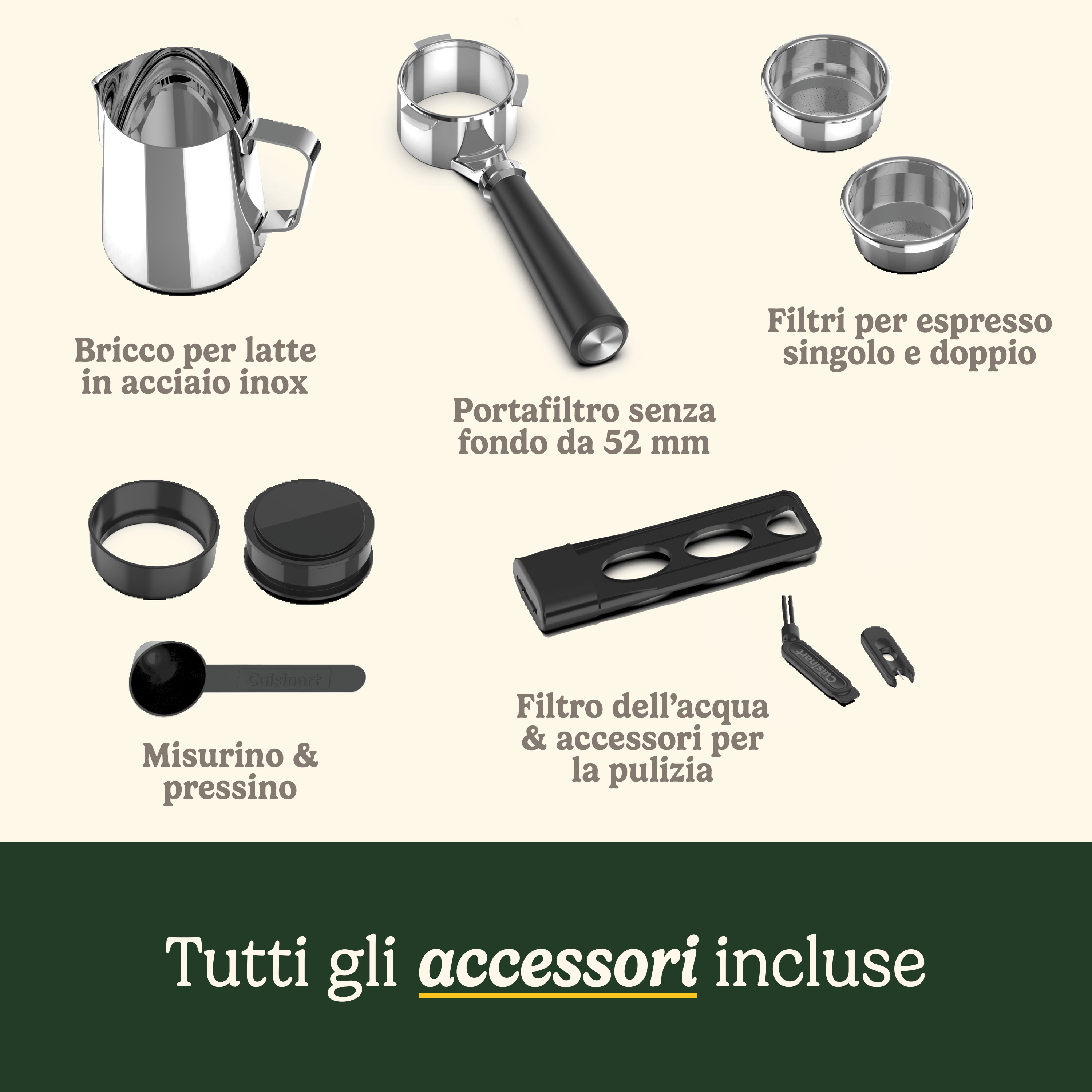 - Tutto il necessario per iniziare: Completa di accessori per iniziare subito come un professionista: bricco per il latte in acciaio inox, filtri per singola e doppia dose, misurino e pressino.
